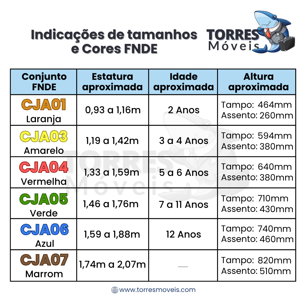 Conjunto escolar Torres Dipper – CJA06 com tampo em polipropileno, padrão FNDE, composto por uma mesa e uma cadeira, em conformidade com a norma ABNT NBR 14006:2008 – Móveis escolares.
